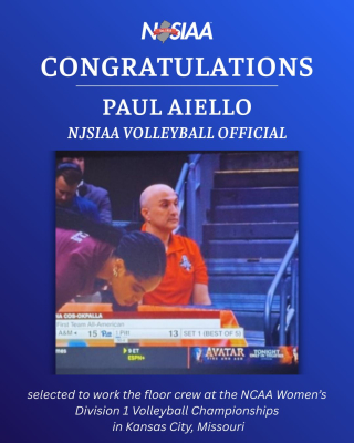 NJSIAA congratulates Paul Aiello, NJSIAA volleyball official, for being selected to work the floor crew at the NCAA Women’s Division 1 Volleyball Championships in Kansas City, Missouri this past weekend.